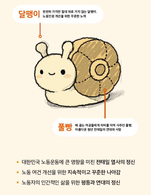 전태일기념관은 풀팽이와 함께 전태일의 정신을 널리 알리고 노동인권이 존중받는 세상을 위한 한 걸음을 내딛고자 합니다.